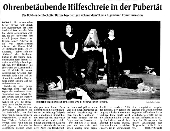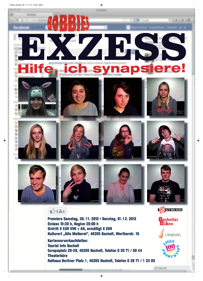 „Exzess! Hilfe, ich synapsiere“ lautet der Titel des neuesten Theaterstücks, welches von den Bobbies in Zusammenarbeit mit Regisseur Ralf Melzow kreiert wurde. „Bobbies“, das sind die „Kleinen“ der Bocholter Bühne. Es handelt sich bei den Bobbies um rund 20 Jugendliche ab 13 Jahren, die in der alten Molkerei in Bocholt Fähigkeiten im Bereich Theater und Improvisation erwerben und entwickeln. Die alte Molkerei bietet mit ihrer guten technischen Ausstattung den jungen Menschen eine ideale Umgebung für die Schauspielerei.